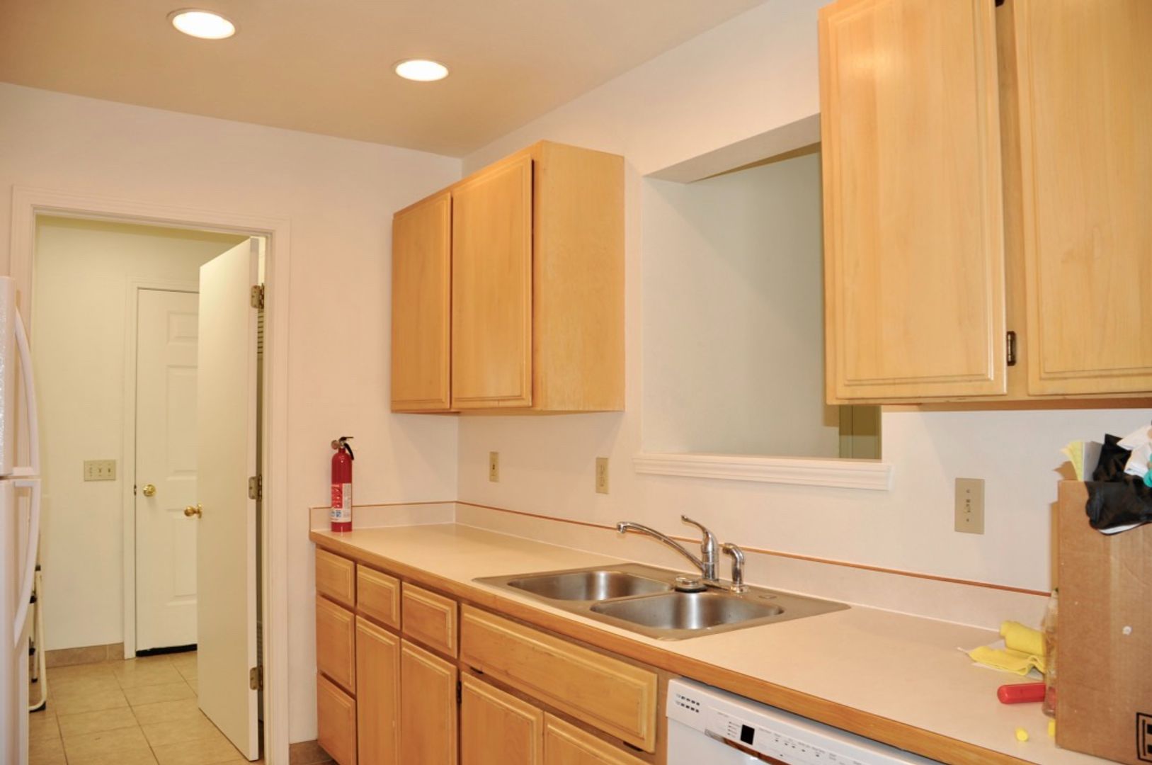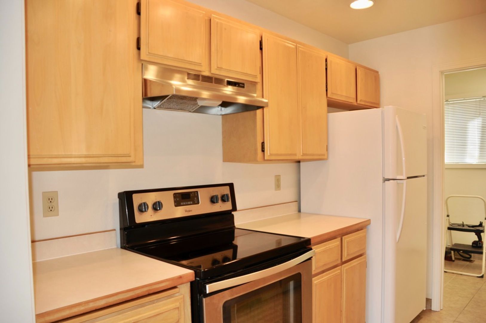 New appliances in the galley kitchen include a stainless steel glass top range, white GE dishwasher, white refrigerator and garbage disposal.
