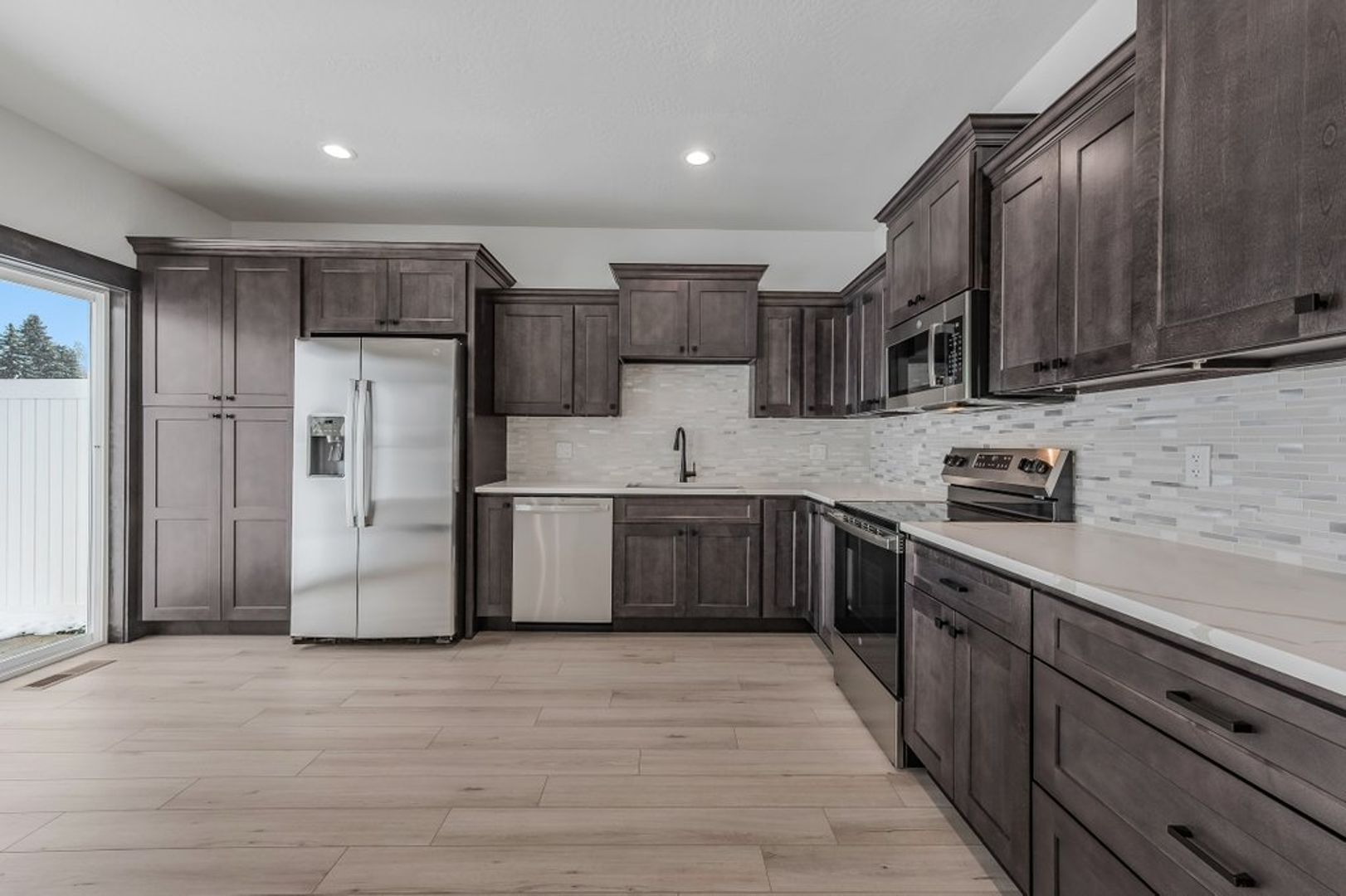 First floor has a 1 car extended garage, living room with gas fireplace and kitchen with waterfall quartz counters, stainless steel appliances and pantry.