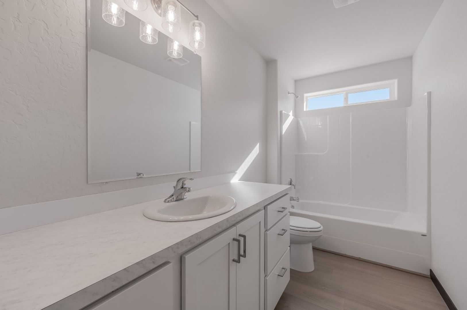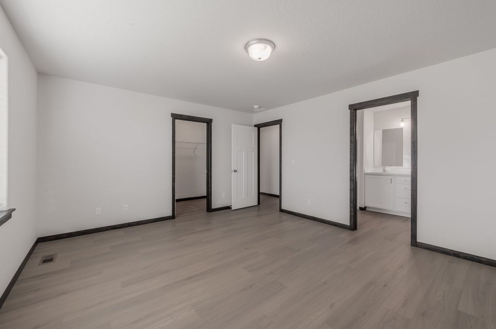 The home's design is enhanced by vaulted ceilings and luxury vinyl plank flooring, adding an air of elegance and sophistication. The main floor master bedroom comes with a double vanity in the master bathroom, providing ample space and convenience. Plus, the covered patio offers a perfect spot for outdoor relaxation.