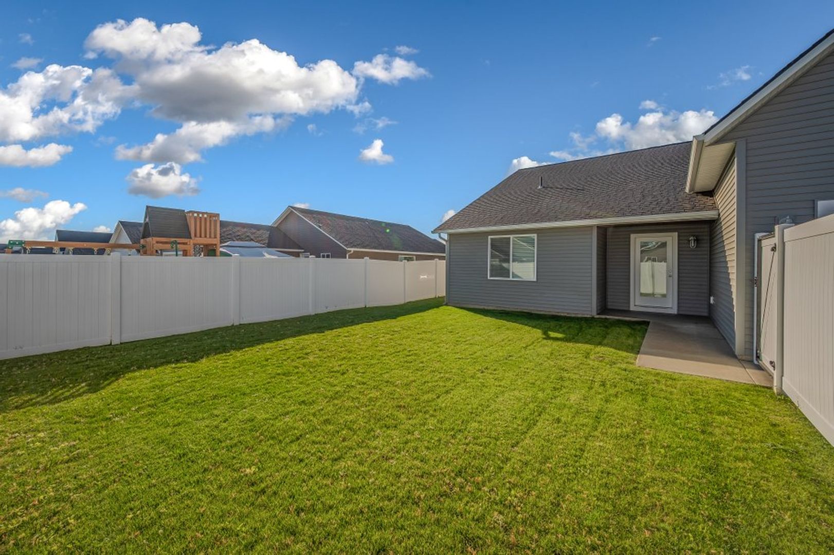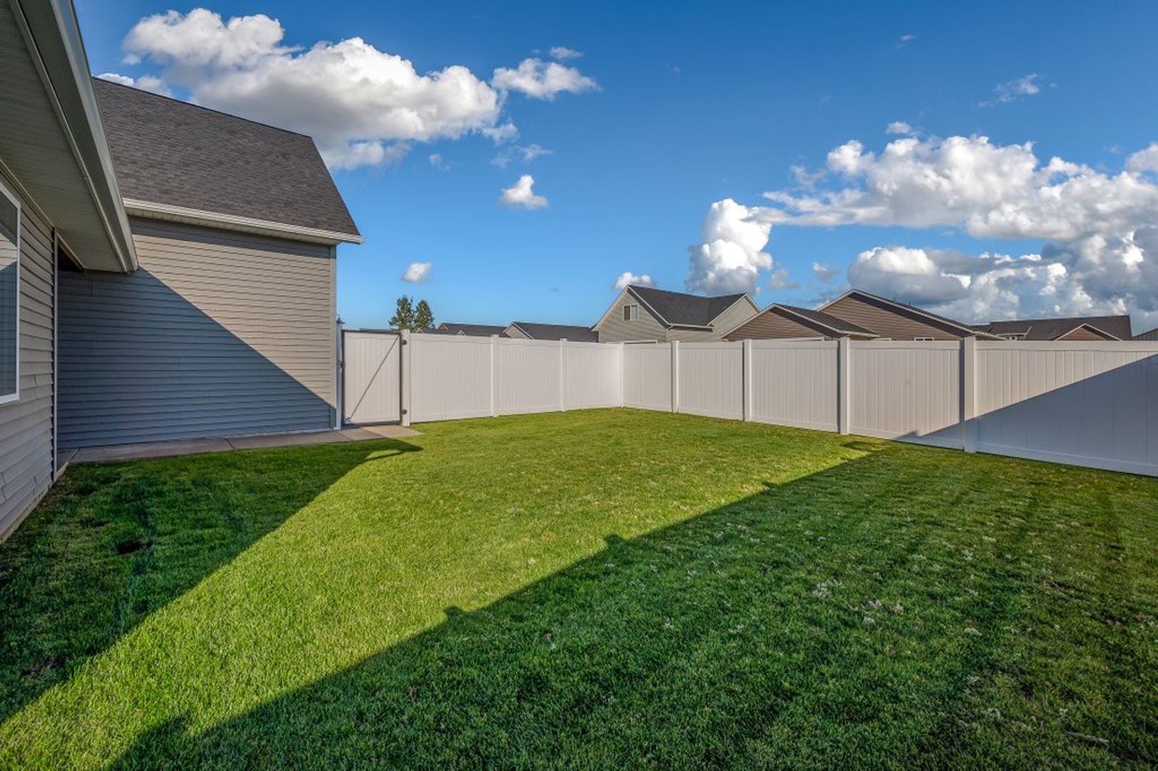 The yard is fully fenced and equipped with a sprinkler system, ensuring easy maintenance and privacy.