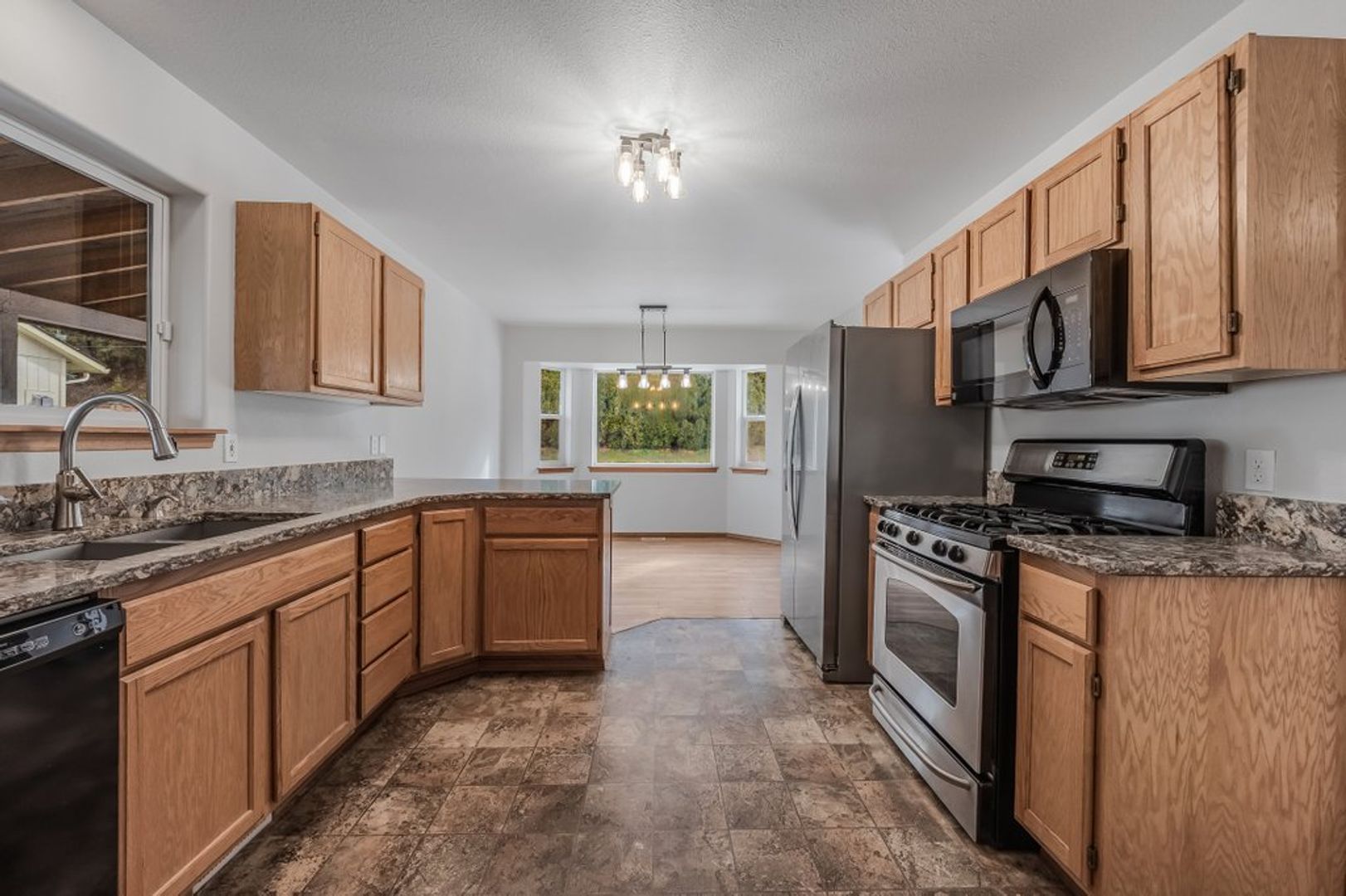 Kitchen has granite counter tops, stainless steel appliances that include a gas range, dishwasher, built in microwave, and fridge. Dining area, large kitchen and laundry room with additional storage closet. Washer/Dryer hook-ups.