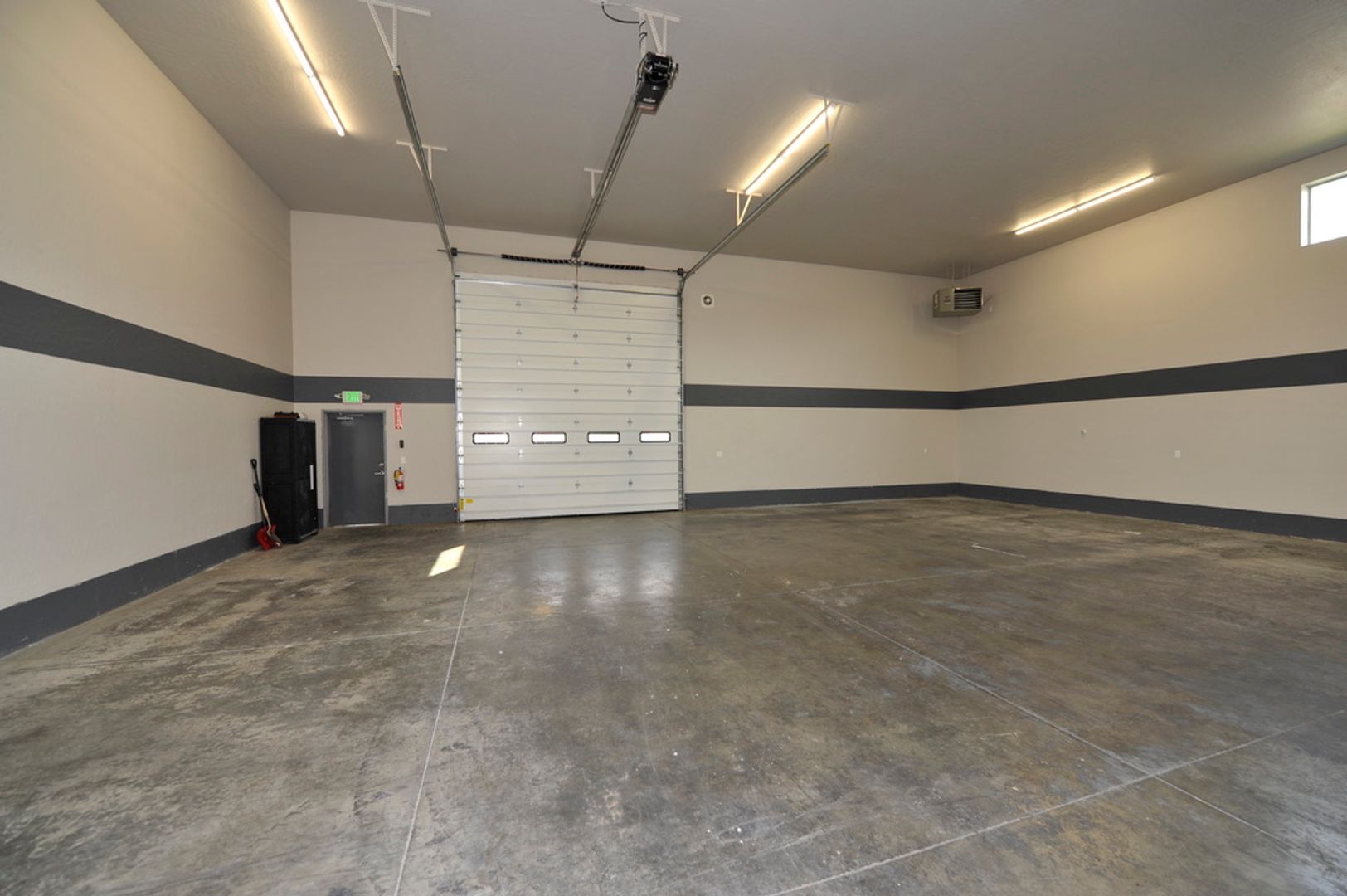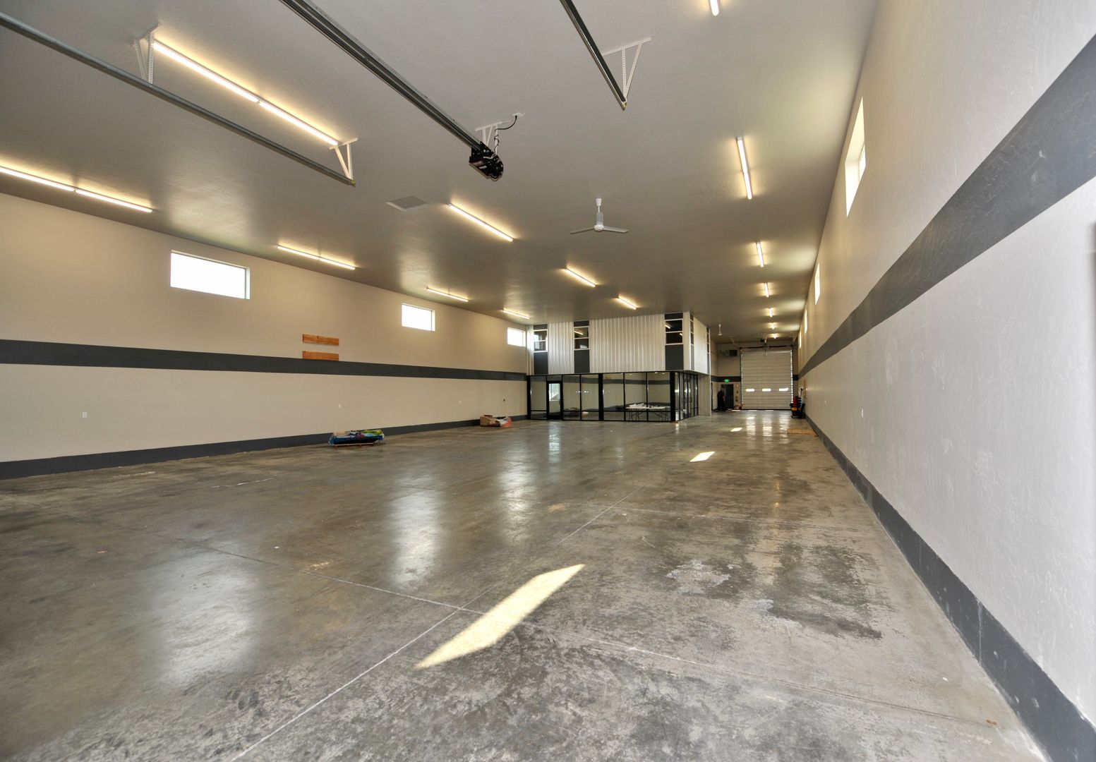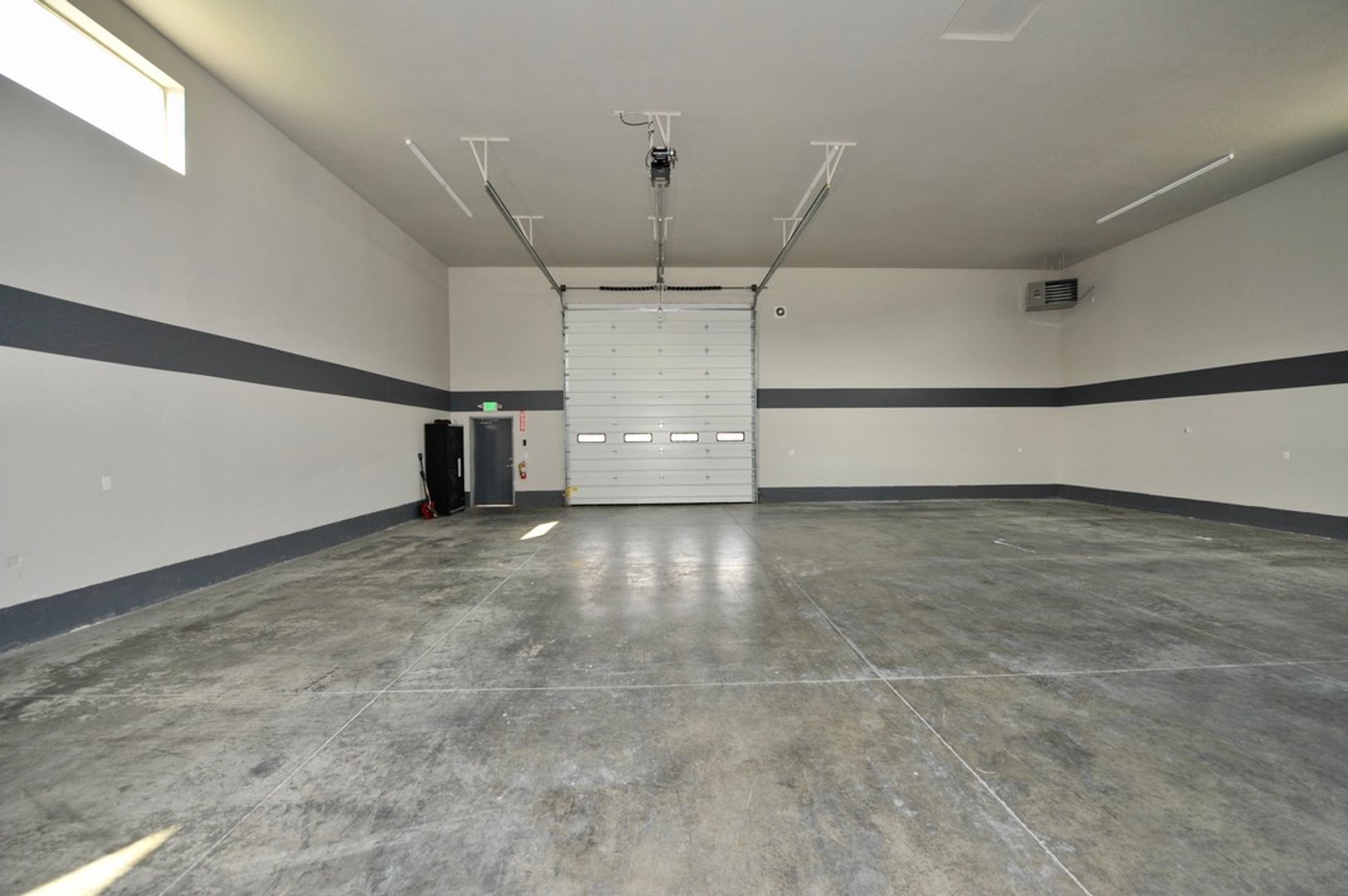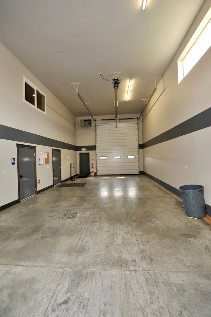 Finished heated warehouse space with 17' ceilings and two 15' tall overhead electric garage doors.