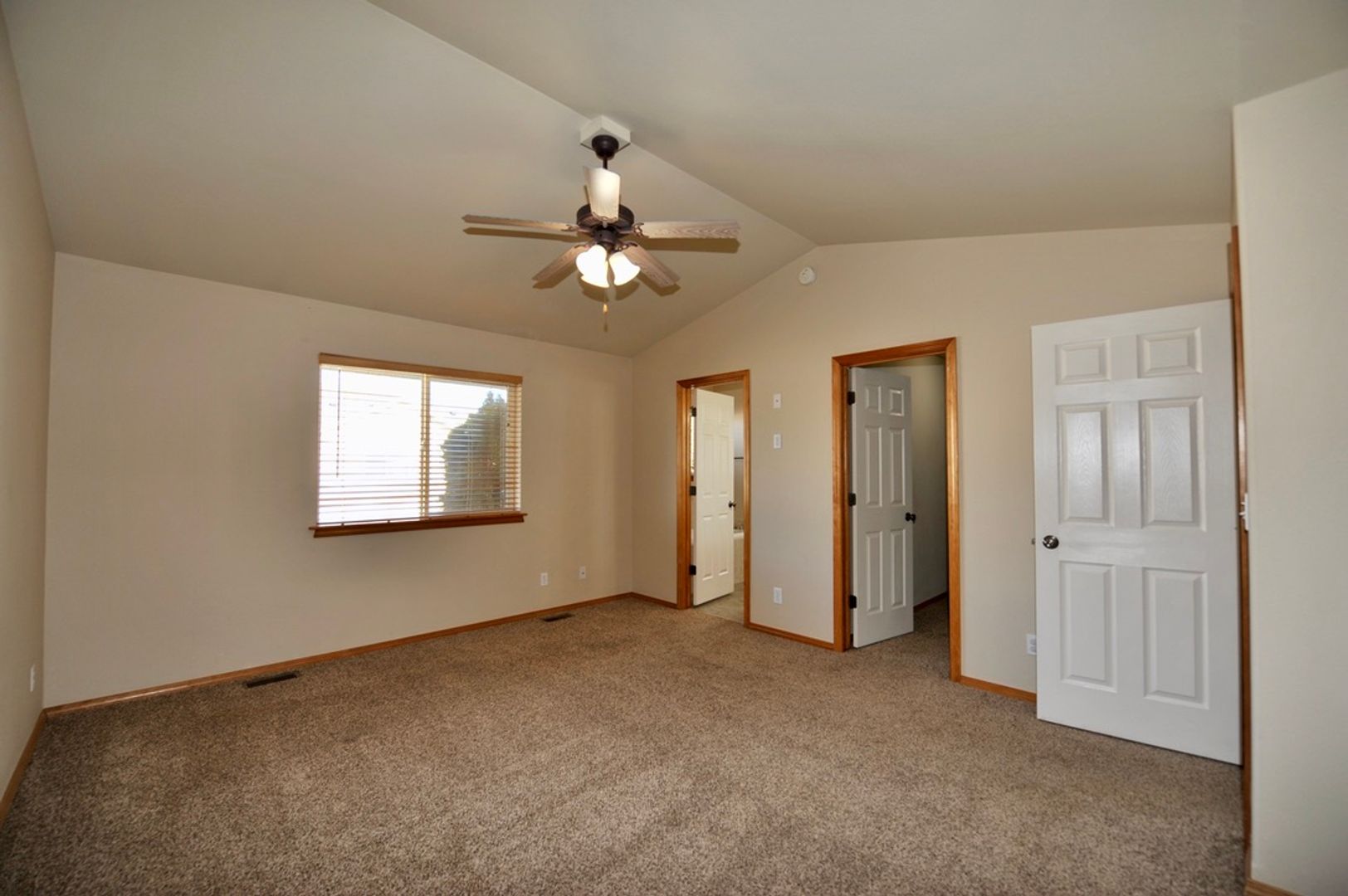 There is a double sided gas fireplace in between the dining area and living room. The living room has vaulted ceilings and a ceiling fan with large windows to let in natural light.