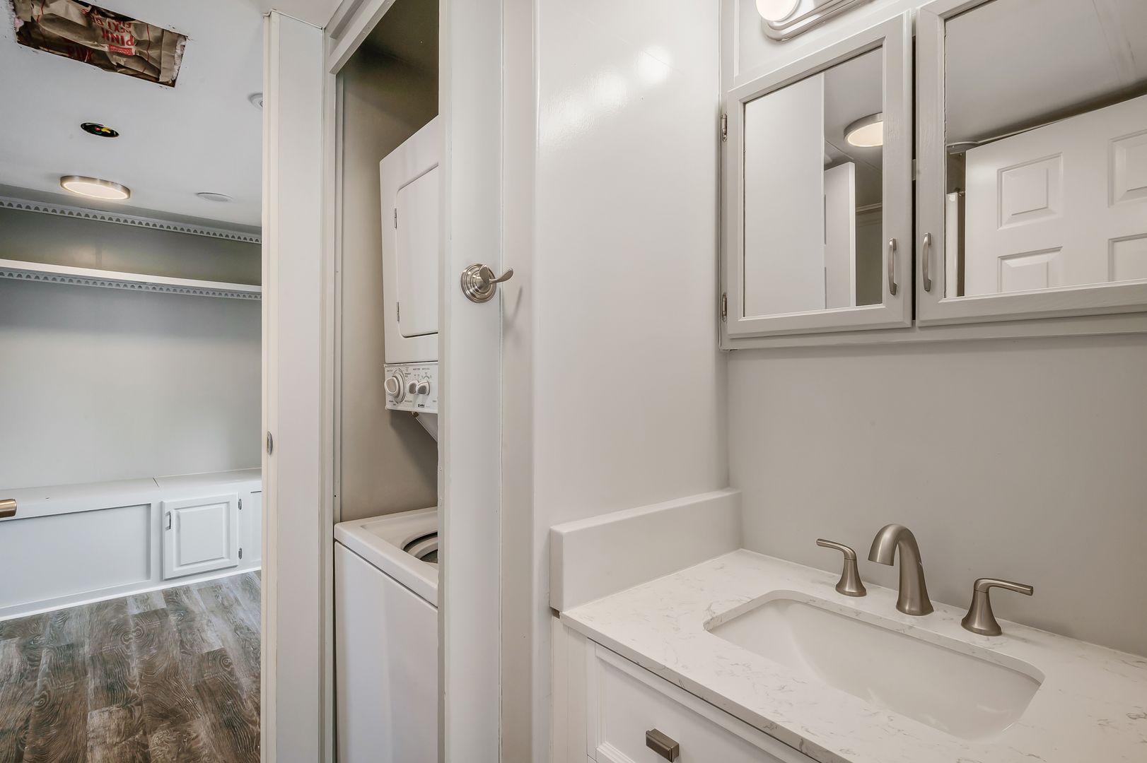 Numerous windows bathe the interior with natural light while contemporary flooring and a custom paint palette create a bright and welcoming ambience. Comfort conveniences include a central forced-air gas furnace, central AC, stacked laundry machines, covered front entry, and two gravel parking spaces directly in front of the home.