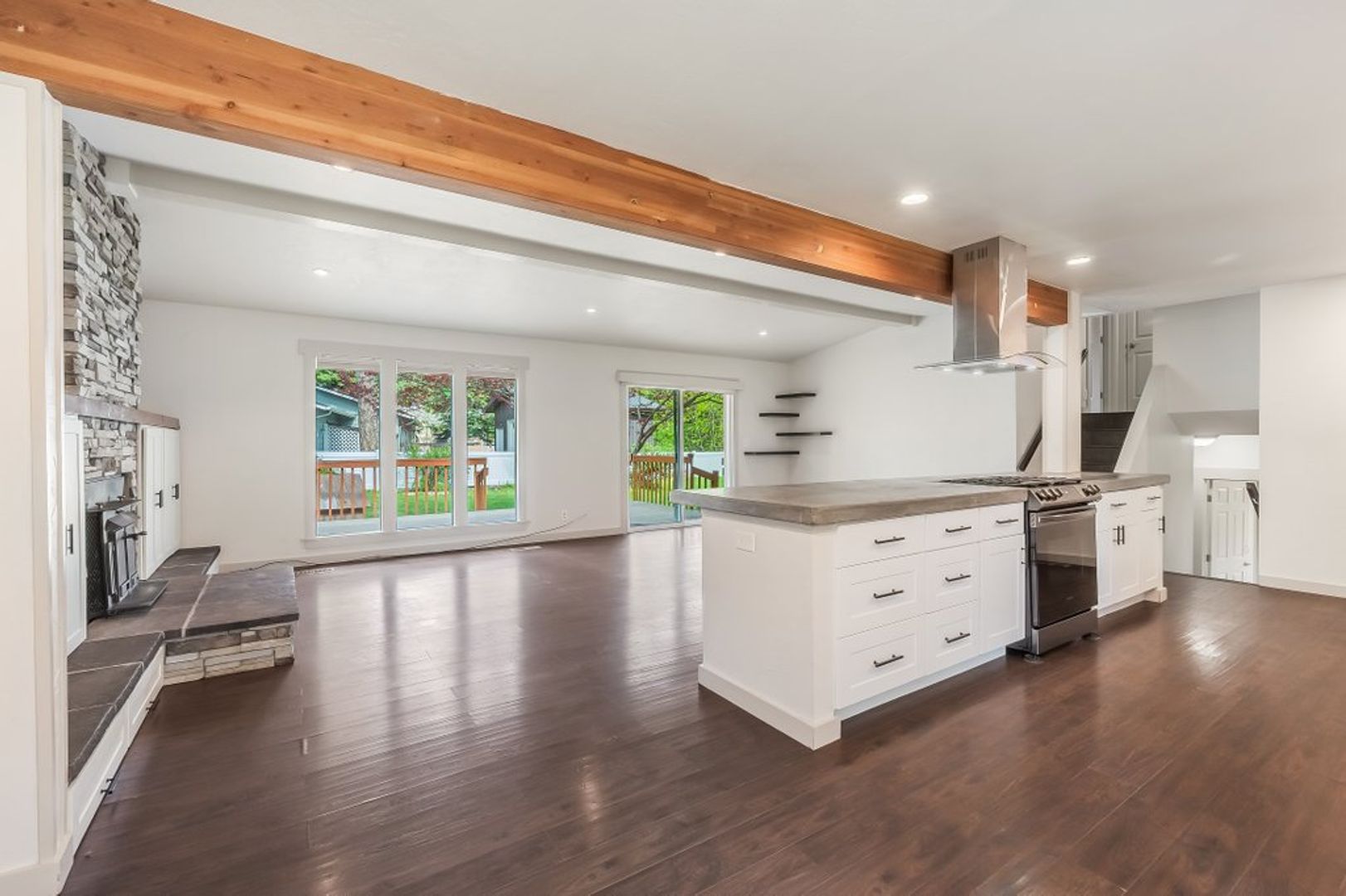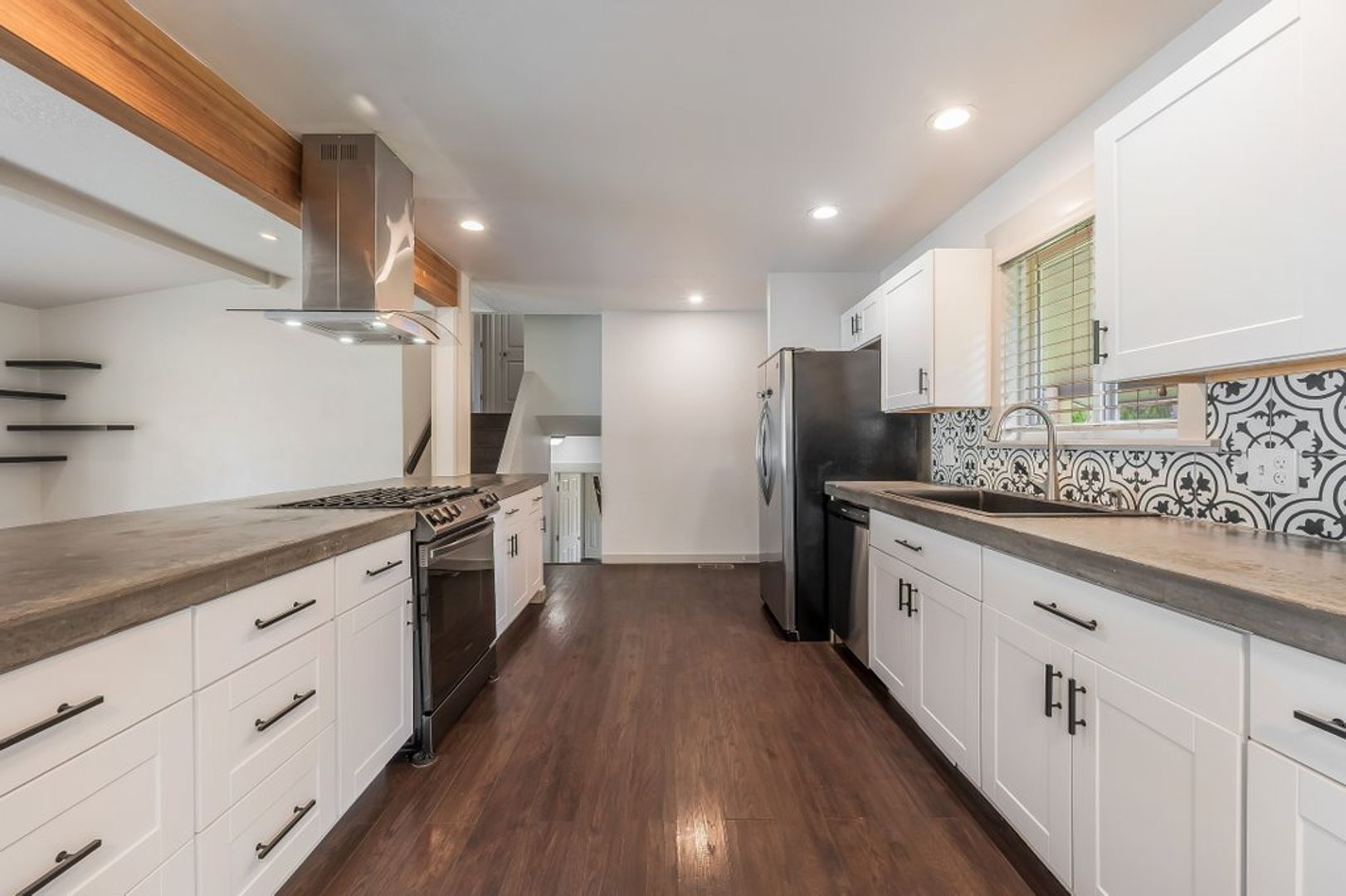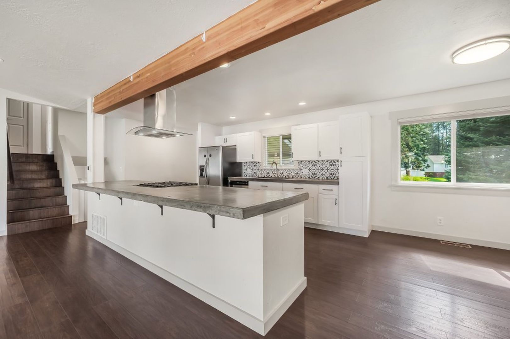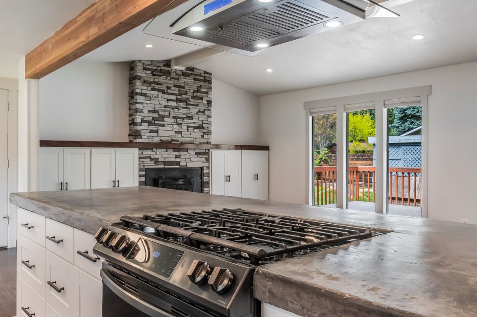 Kitchen has extended concrete countertops, stainless steel appliances to include a gas range, refrigerator and dishwasher.