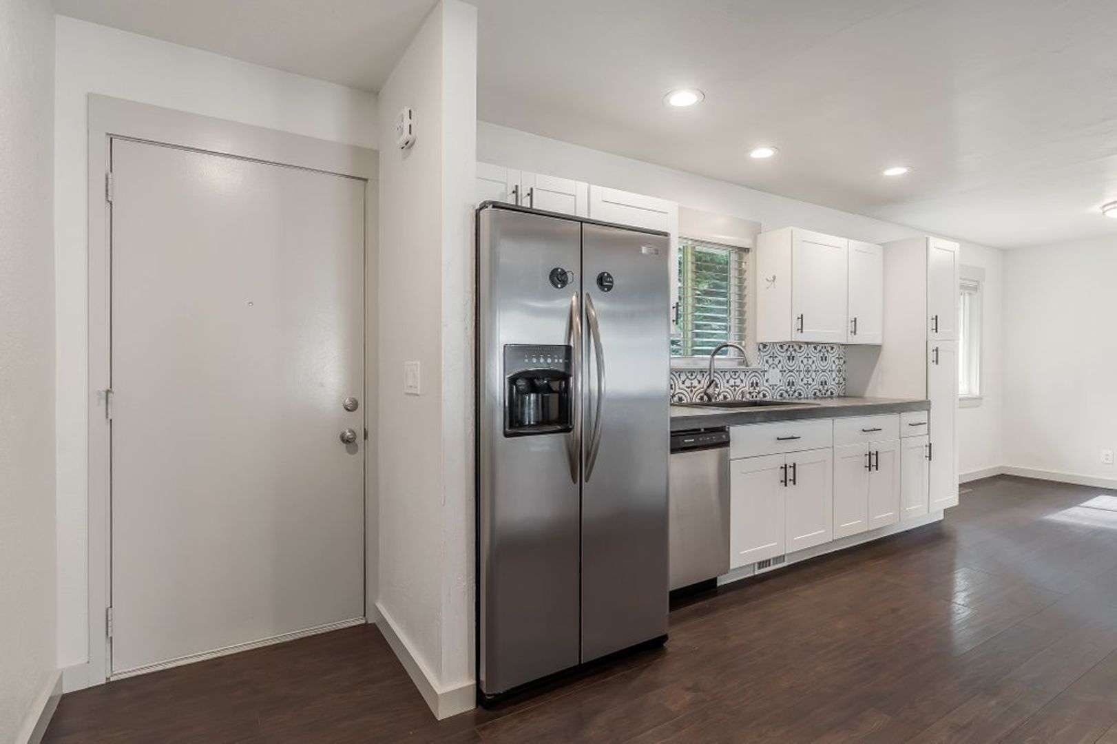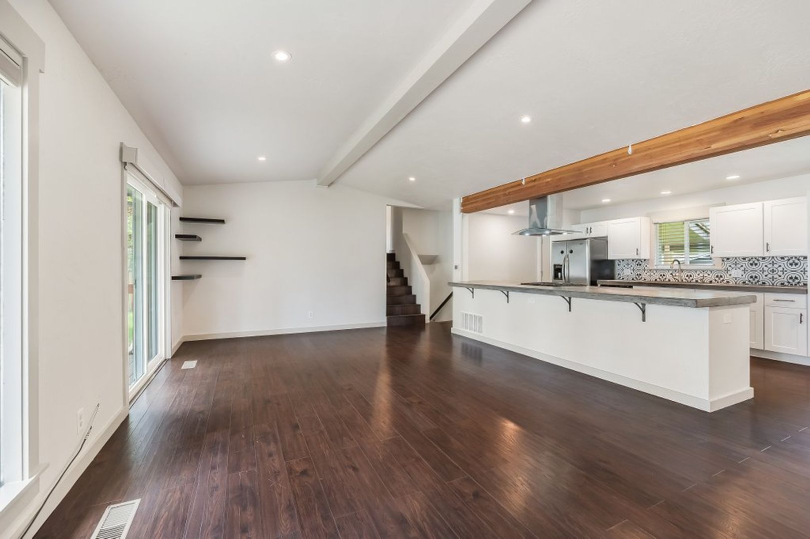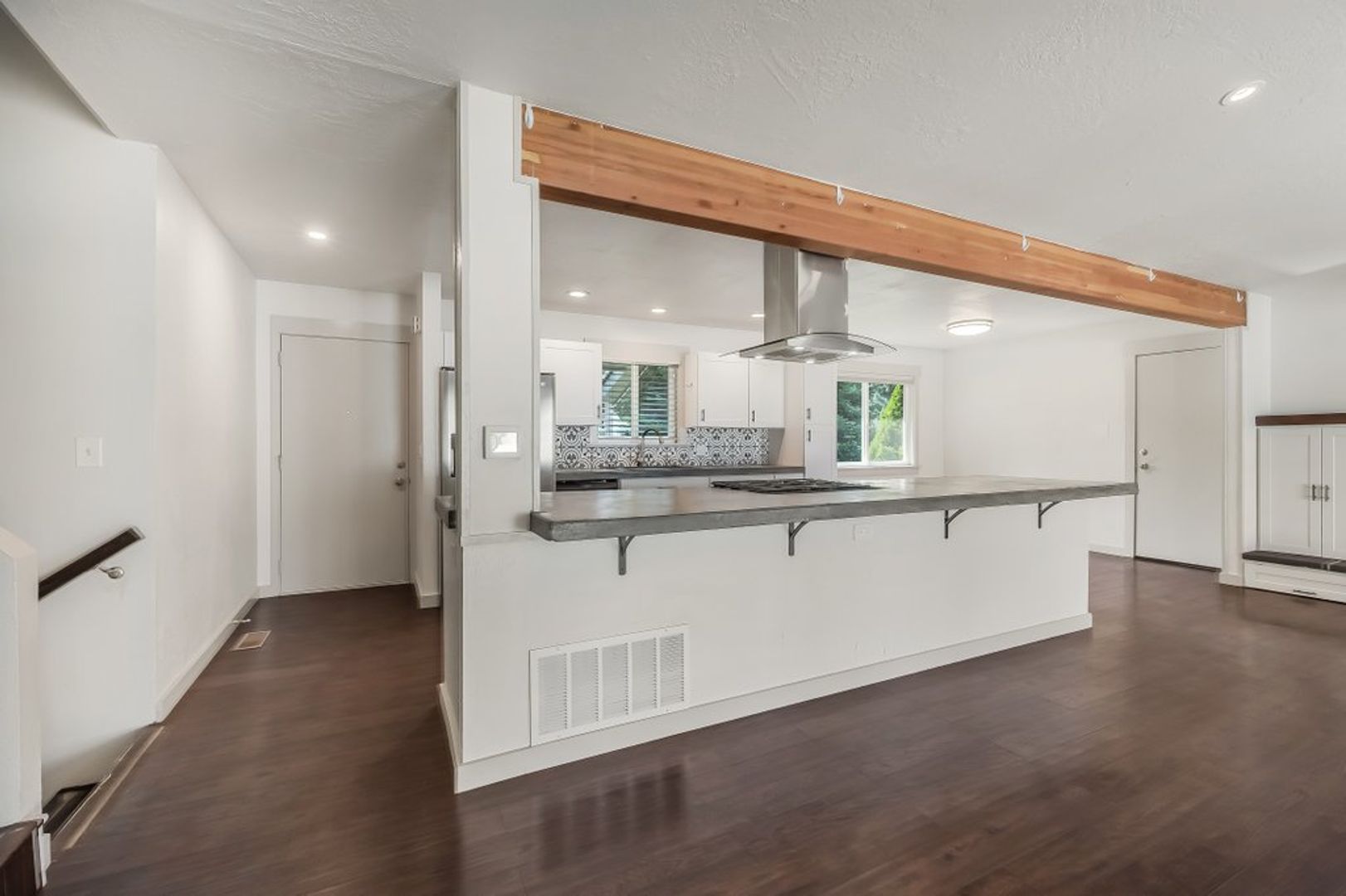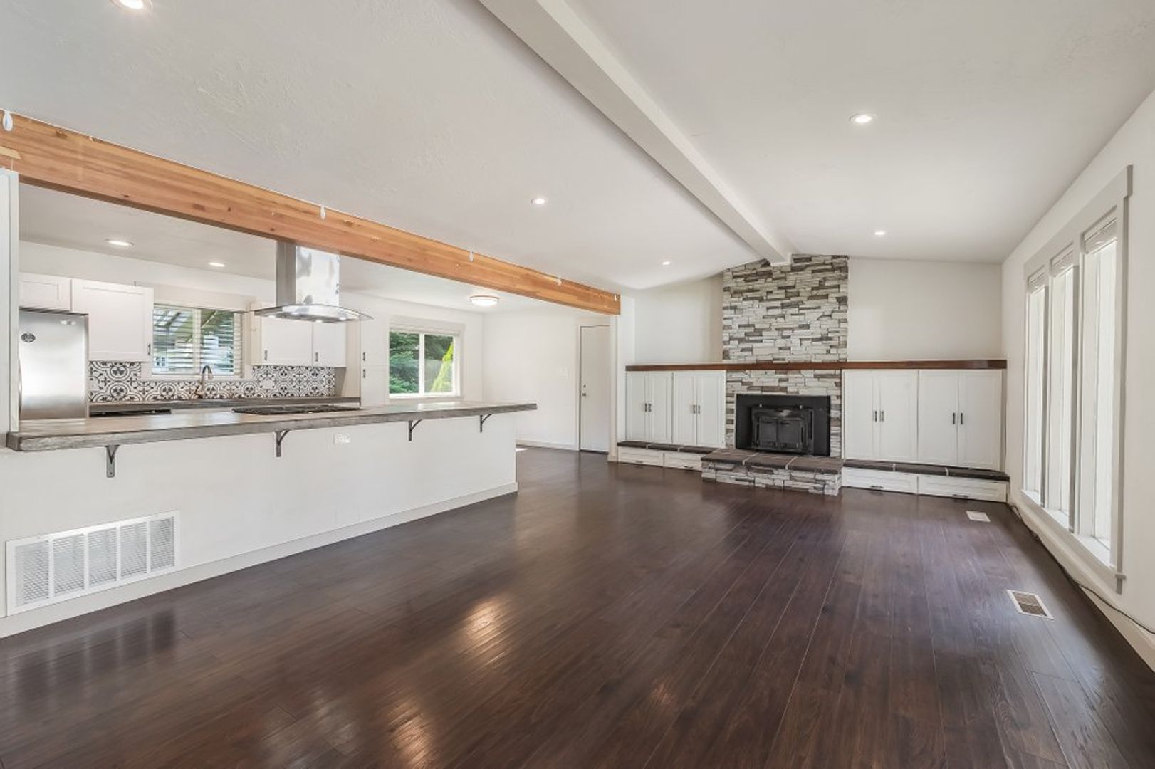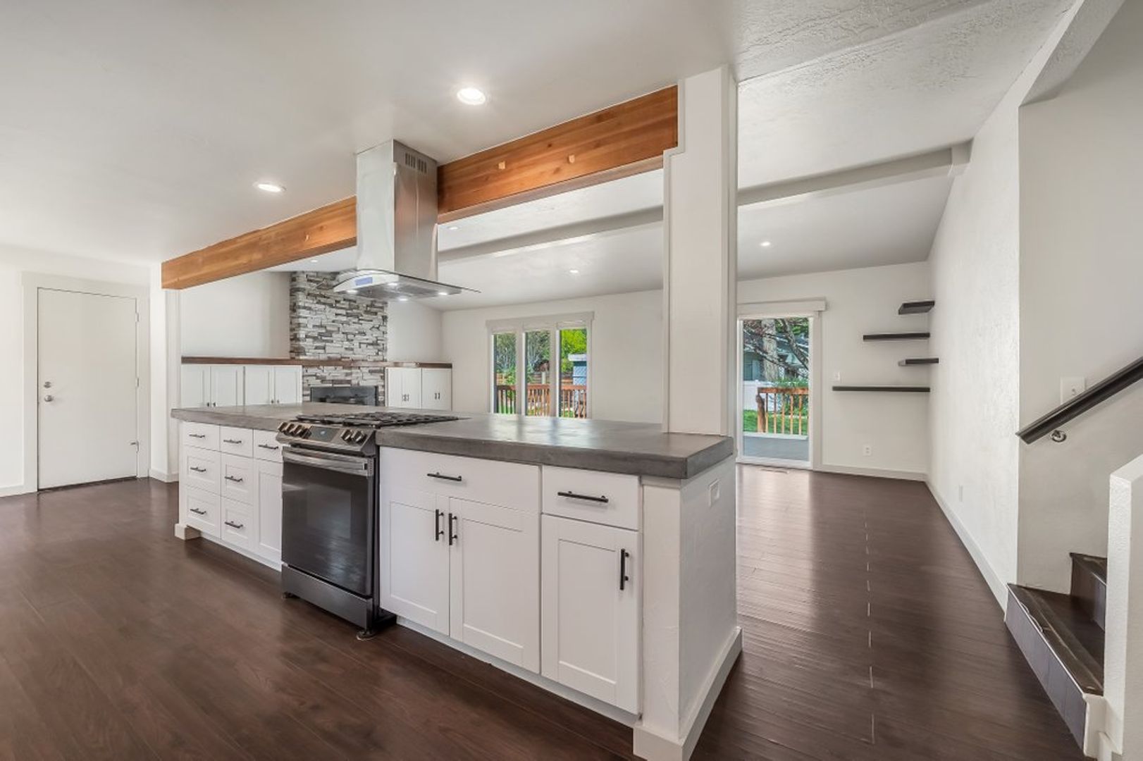Kitchen has extended concrete countertops, stainless steel appliances to include a gas range, refrigerator and dishwasher.