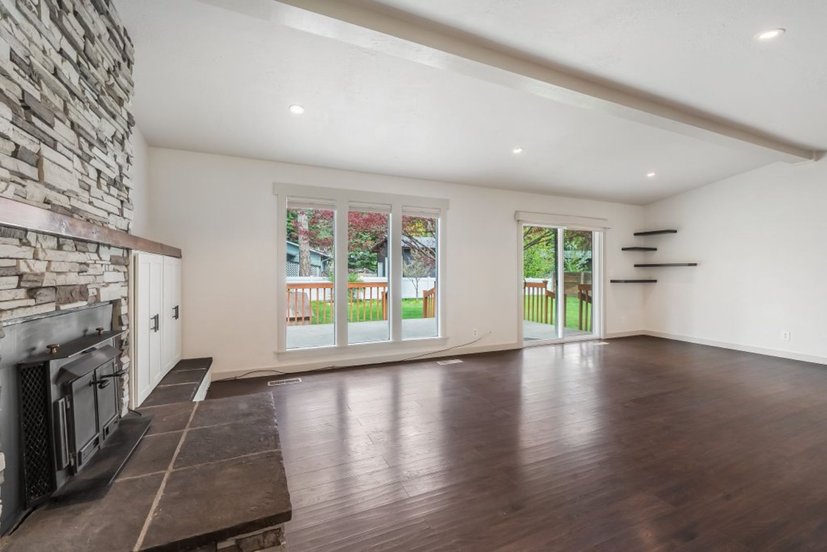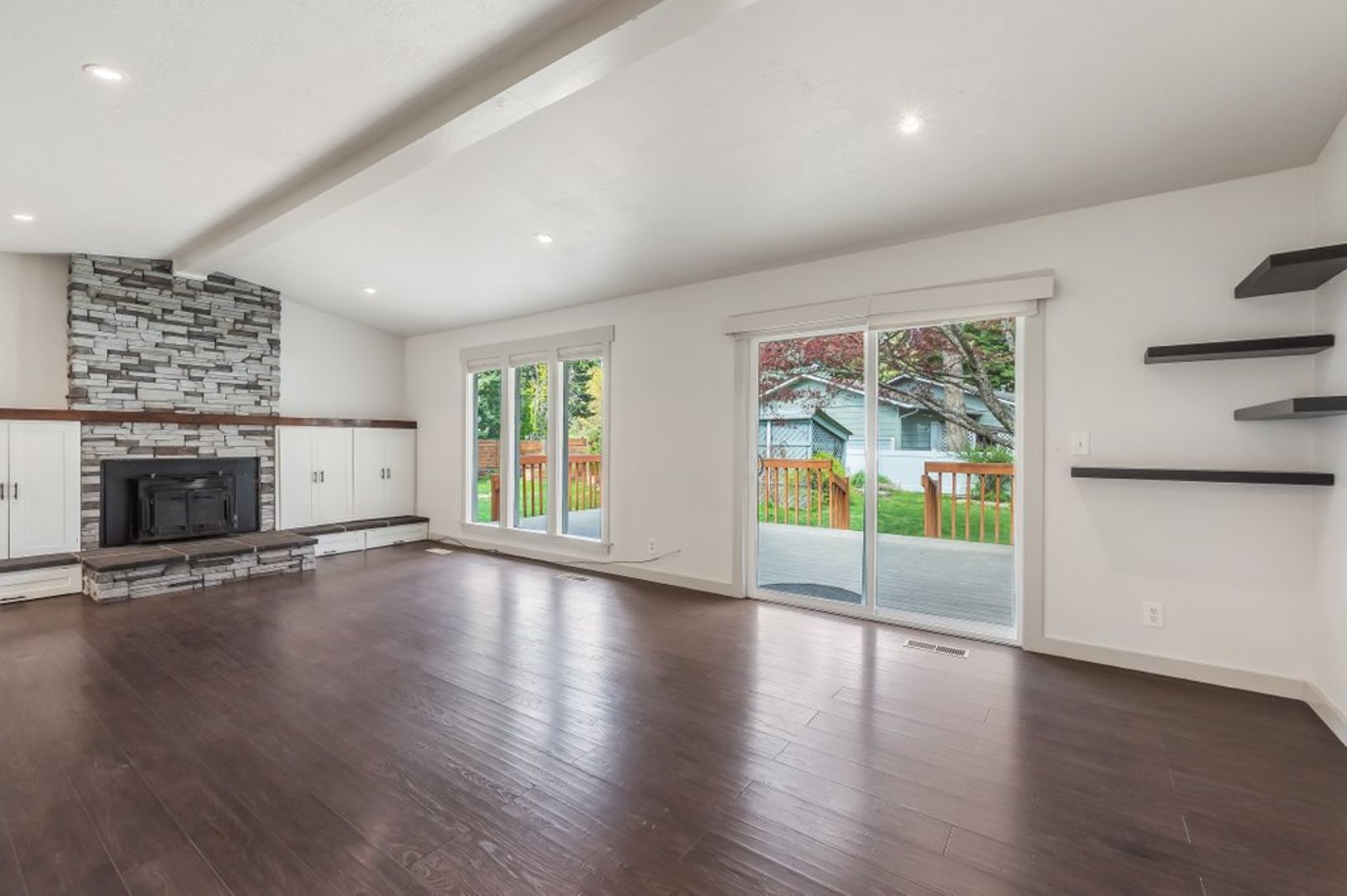 Main level has luxury vinyl flooring with gas fireplace, built in cabinets for storage and dining area with sliding doors out to the deck and yard.